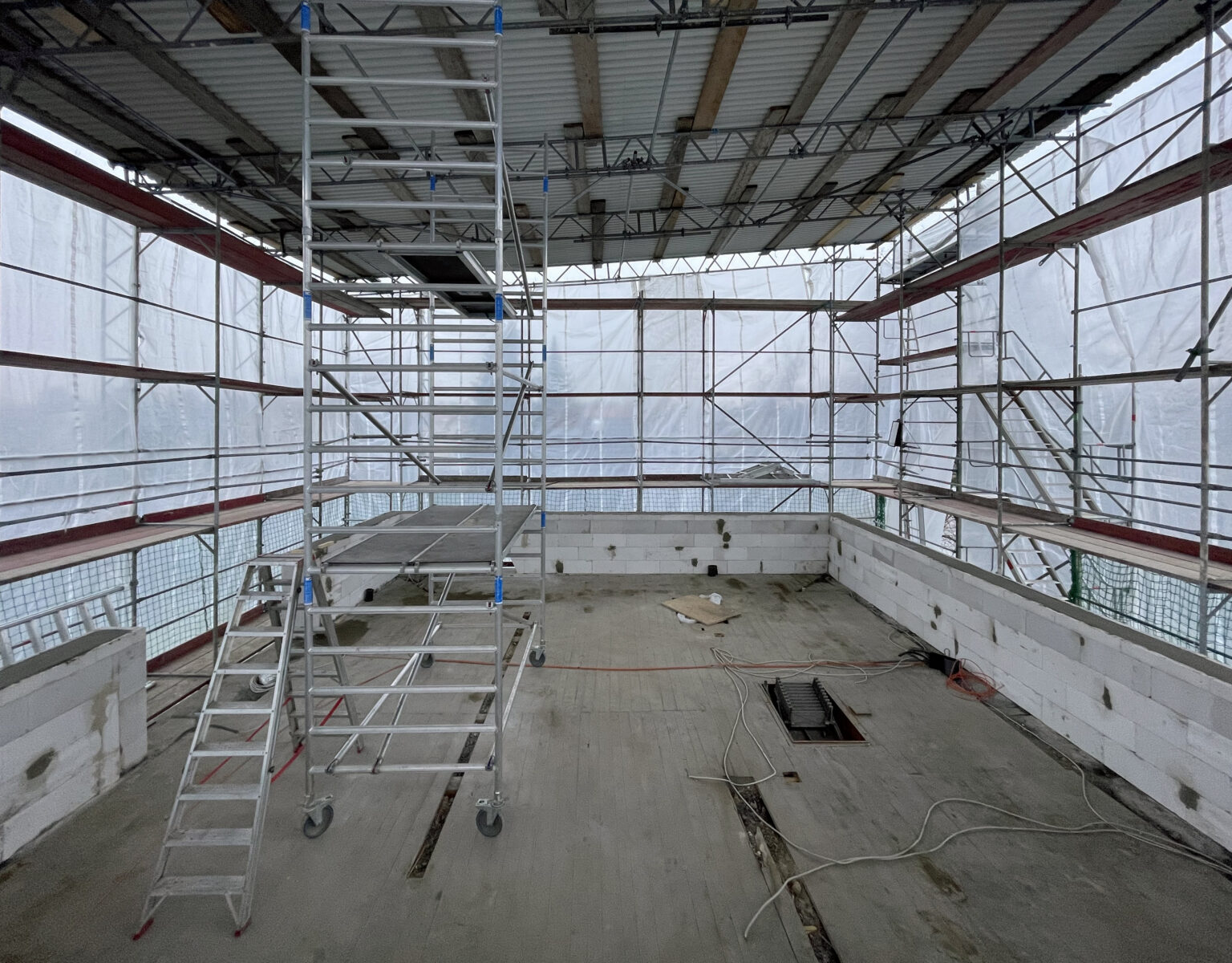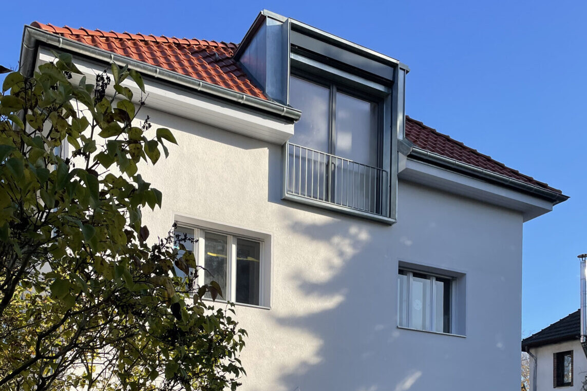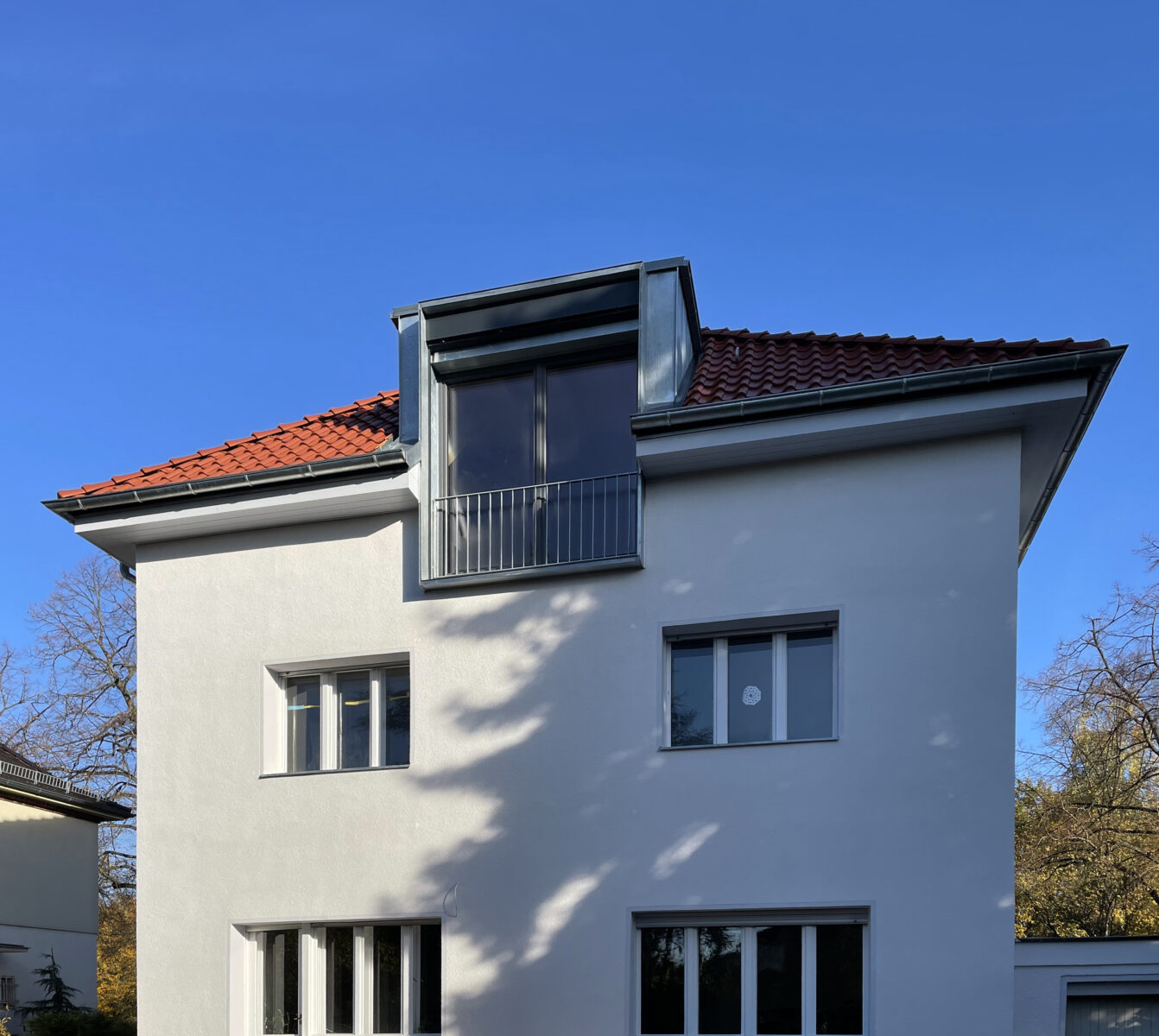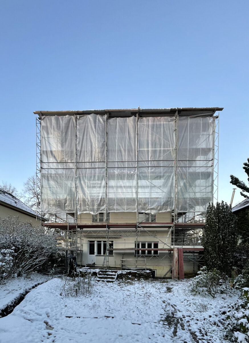 Auch das Dachgeschoss wurde als zusätzliches Geschoss ausgebaut. Dafür wurde ein Kniestock auf die Fassaden aufgemauert und ein neuer Dachstuhl höher wieder aufgesetzt. Weil das Haus während der Sanierung des Daches bewohnt war, wurde ein Gerüst mit eigenem Dach zum Schutz des Hauses aufgestellt.