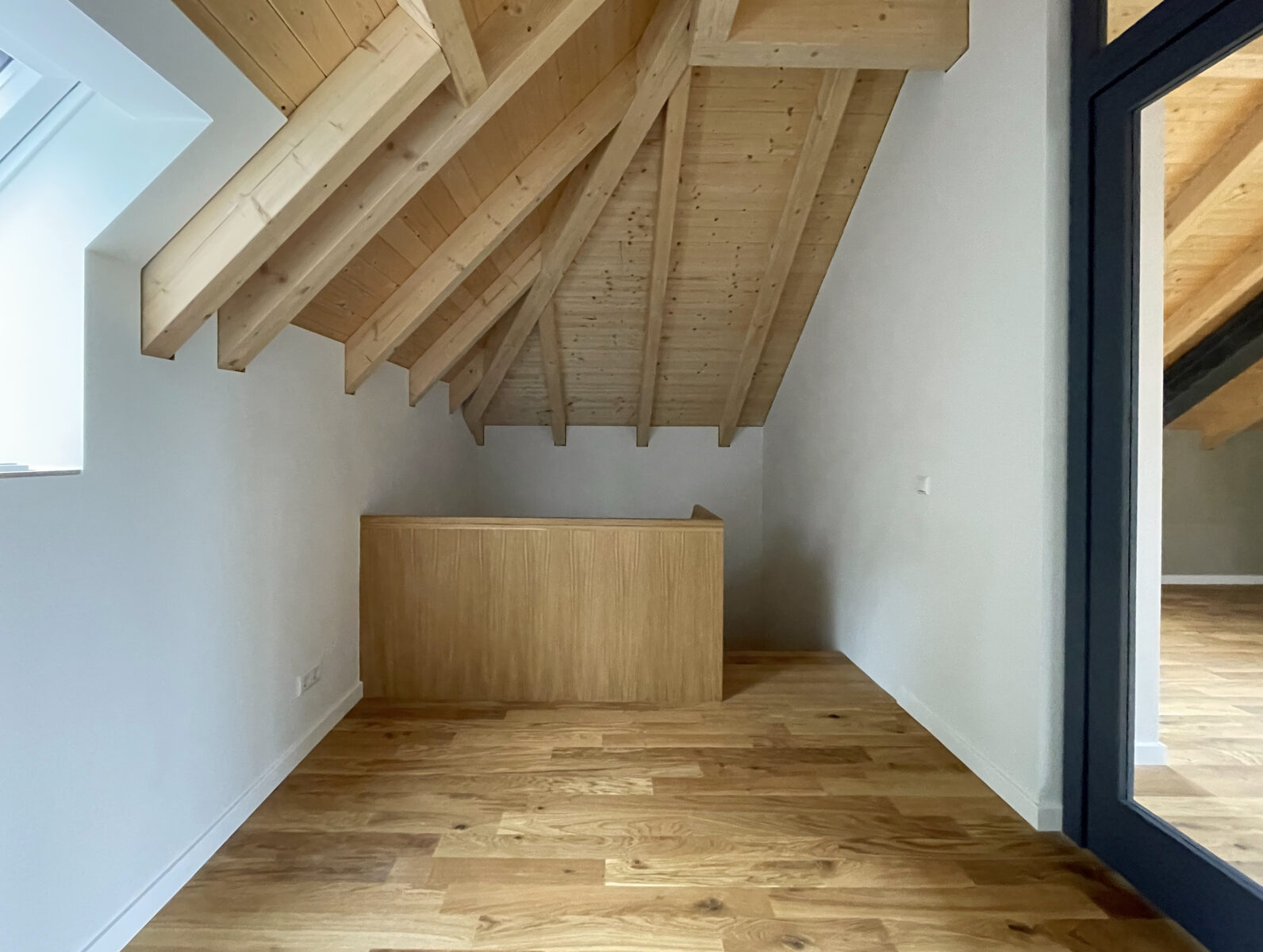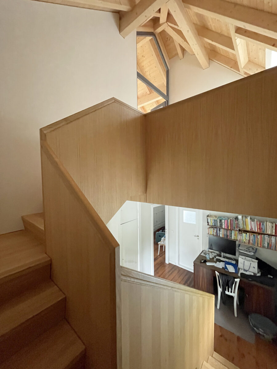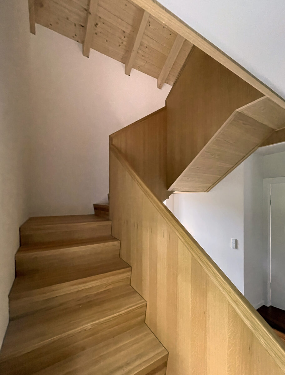Das Dachgeschoss, gedacht als Eltern-Etage, hat eine sichtbare Holzkonstruktion und einen auf den Dachstuhl ausgerichteten Grundriss. Hinauf führt eine Holztreppe, die im Gegensatz zur engen Bestandstreppe als eigenständiges Bauteil inszeniert ist.