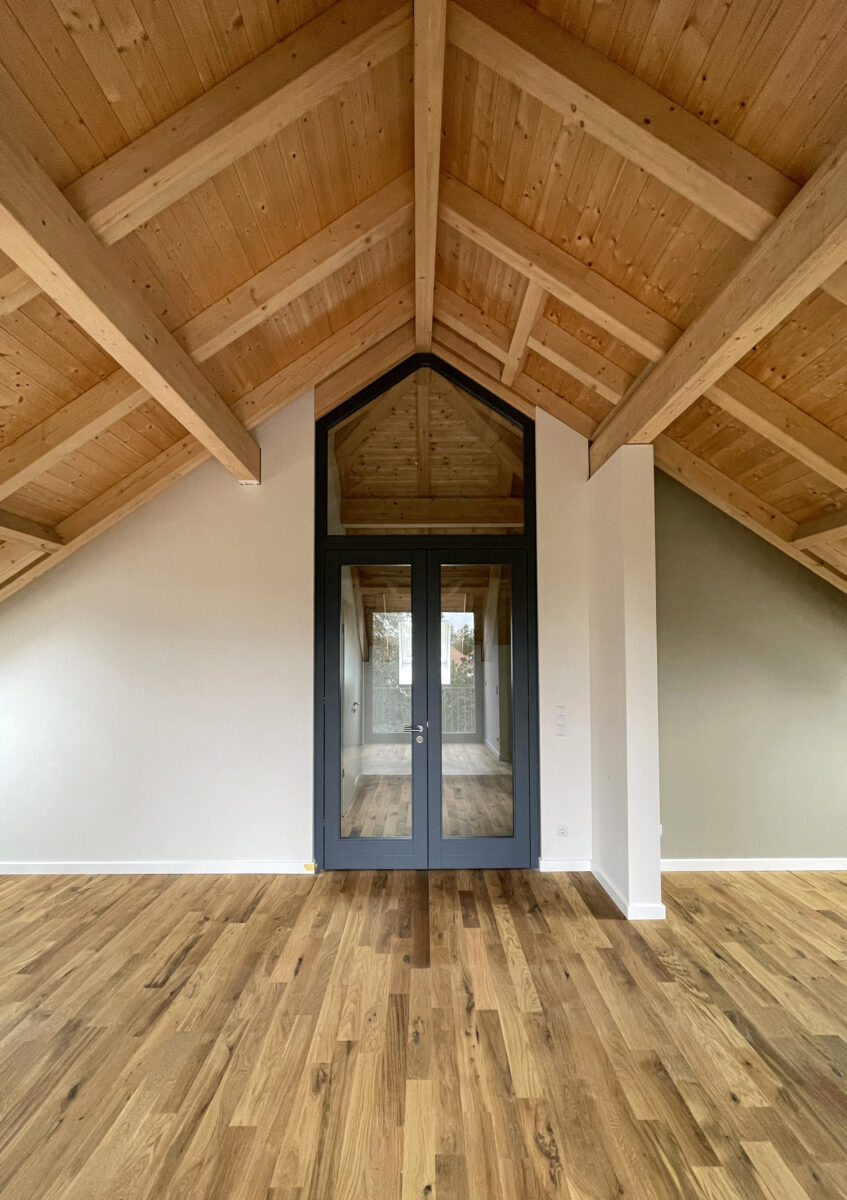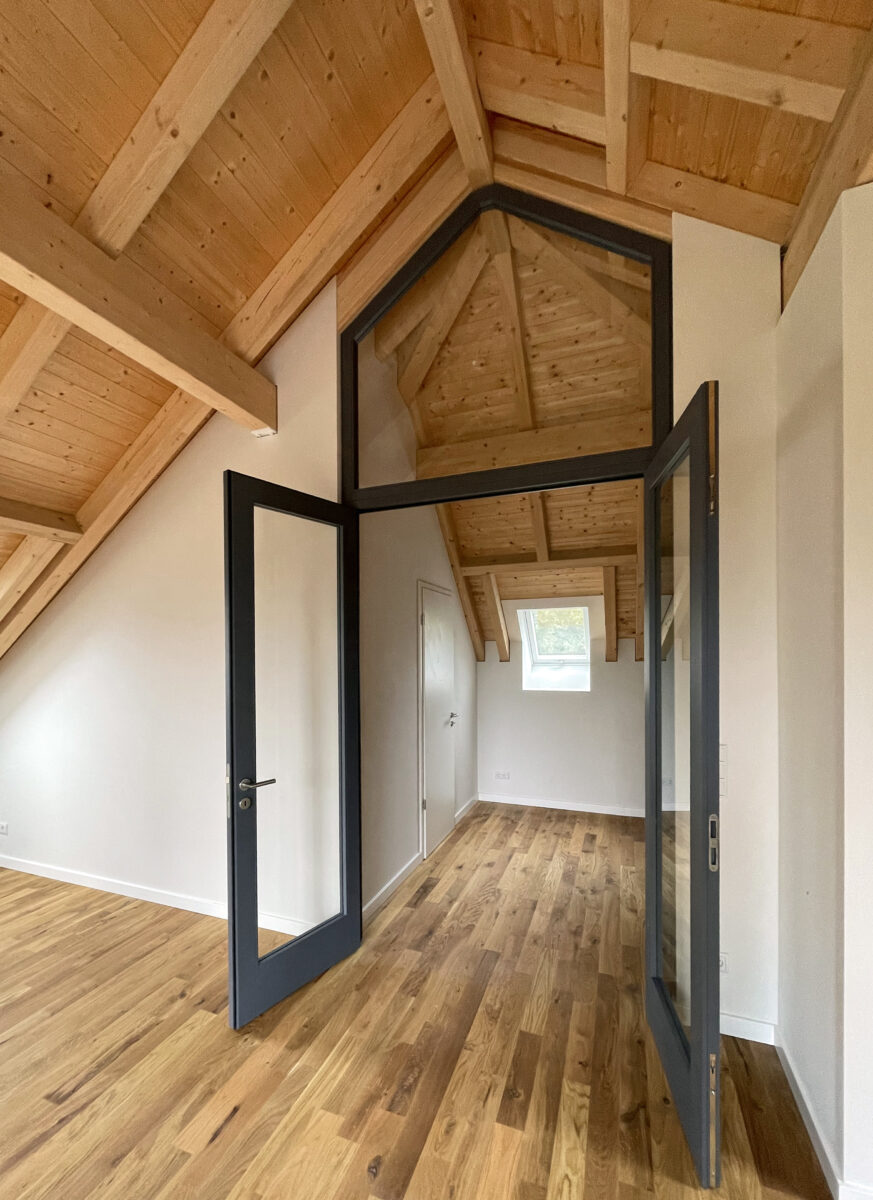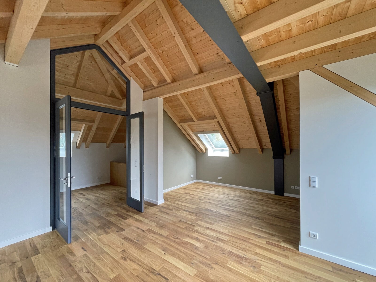 Das Dachgeschoss, gedacht als Eltern-Etage, hat eine sichtbare Holzkonstruktion und einen auf den Dachstuhl ausgerichteten Grundriss. Hinauf führt eine Holztreppe, die im Gegensatz zur engen Bestandstreppe als eigenständiges Bauteil inszeniert ist.