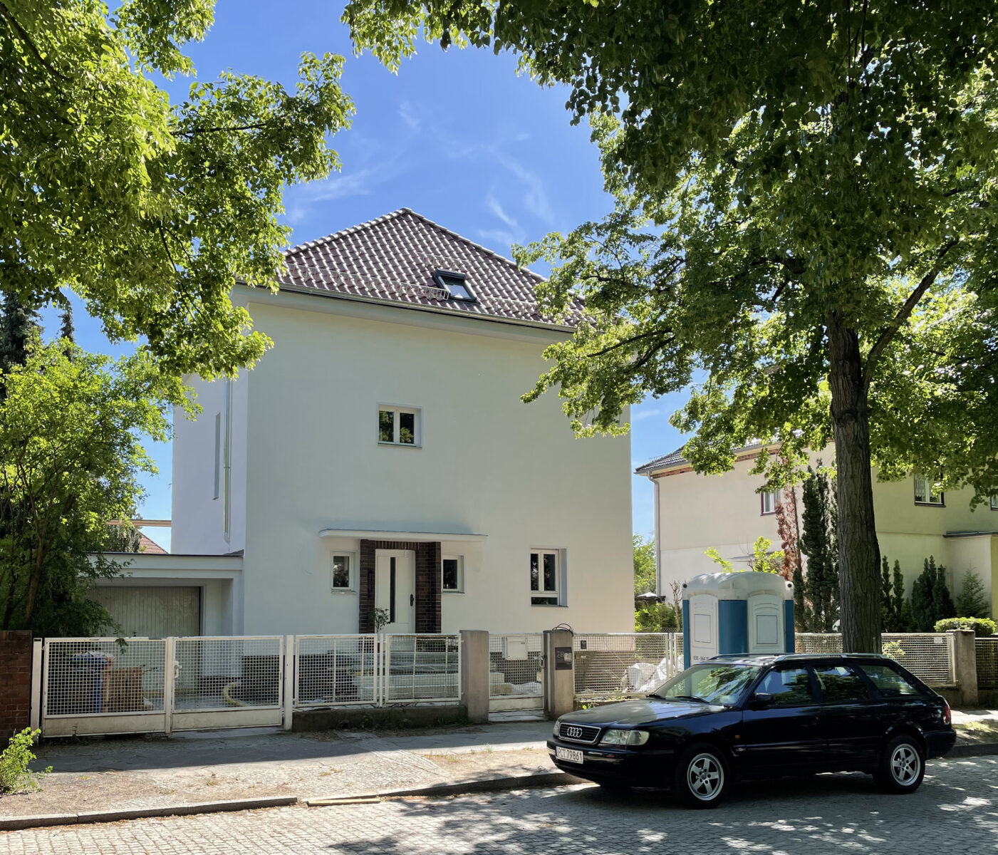 Das Haus aus den dreißiger Jahren wurde saniert und erweitert. Die zwei Wohngeschosse wurden durch das Tieferlegen des Bodens im Keller um ein Geschoss nach unten erweitert. Ein Tiefhof an der Gartenseite erlaubt dort ein großes Fenster.